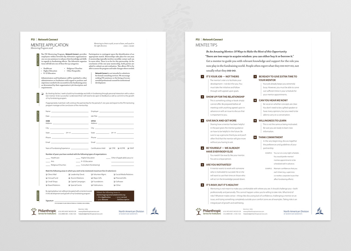 Mentor Application and Mentor Tip sheet — The initial intent was for the forms to be used in hard copy, but evolved into a need for digital/online purposes (e.g., website and email communications). As part of this evolution, the forms were modified to have the ability to be filled in digitally, as well as provide email links for submission.